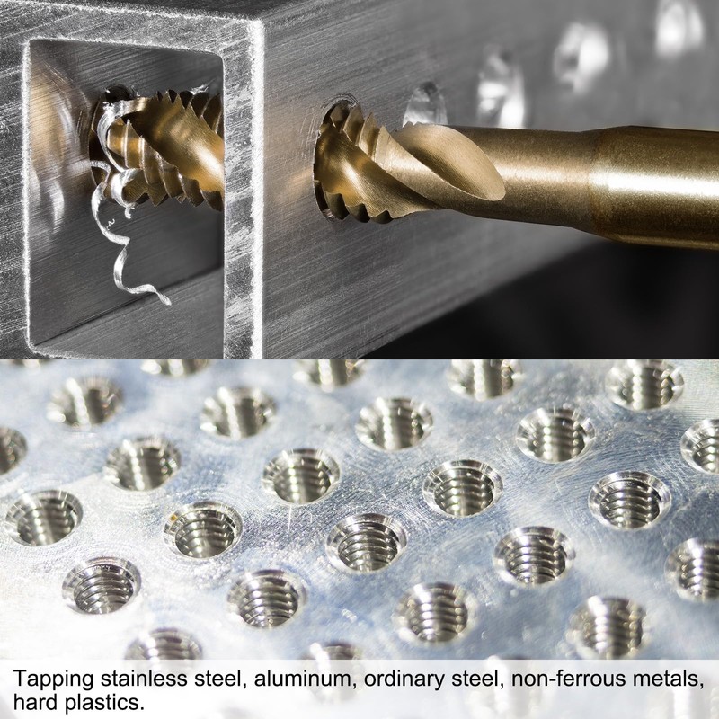 - Applications: Thread taps are great for processing blind holes and sticky materials. Used for drilling and tapping stainless steel, aluminum, alloy steel, ordinary steel, cast iron, non-ferrous metals, hard plastics, etc. Flutes on the screw tap help to remove chips and debris from the hole.
