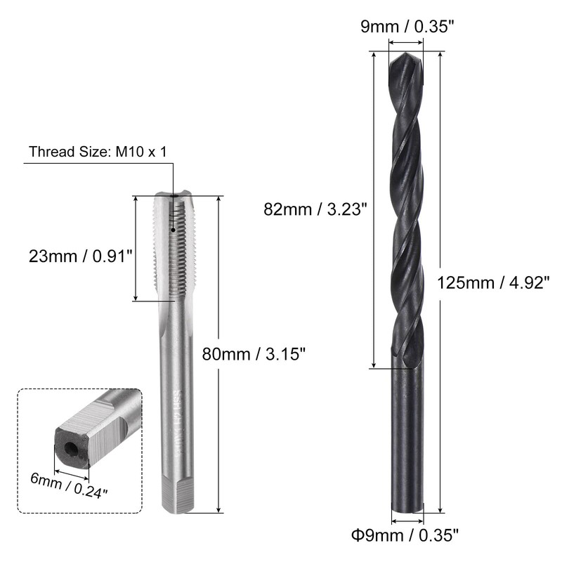 - Metric Tap and Drill Bit Set: Tap thread size: M10 x 1; drill bit size: 9mm. 6542 (M2) high speed steel Metric Tap and Drill Bit Set offers excellent heat resistance and hardness for durability and longevity, and good cutting performance.