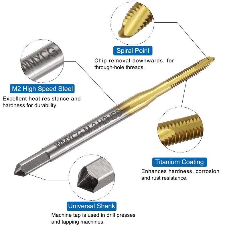Thread tap adopts spiral point and straight flute design, with clear threads and no burrs. Screw tap provides downward chip removal, fast and precise tapping, suitable for through-hole threads. Machine tap is used in drill presses, tapping, CNC and milling machines. Not recommended for hand use and electric drill tapping.