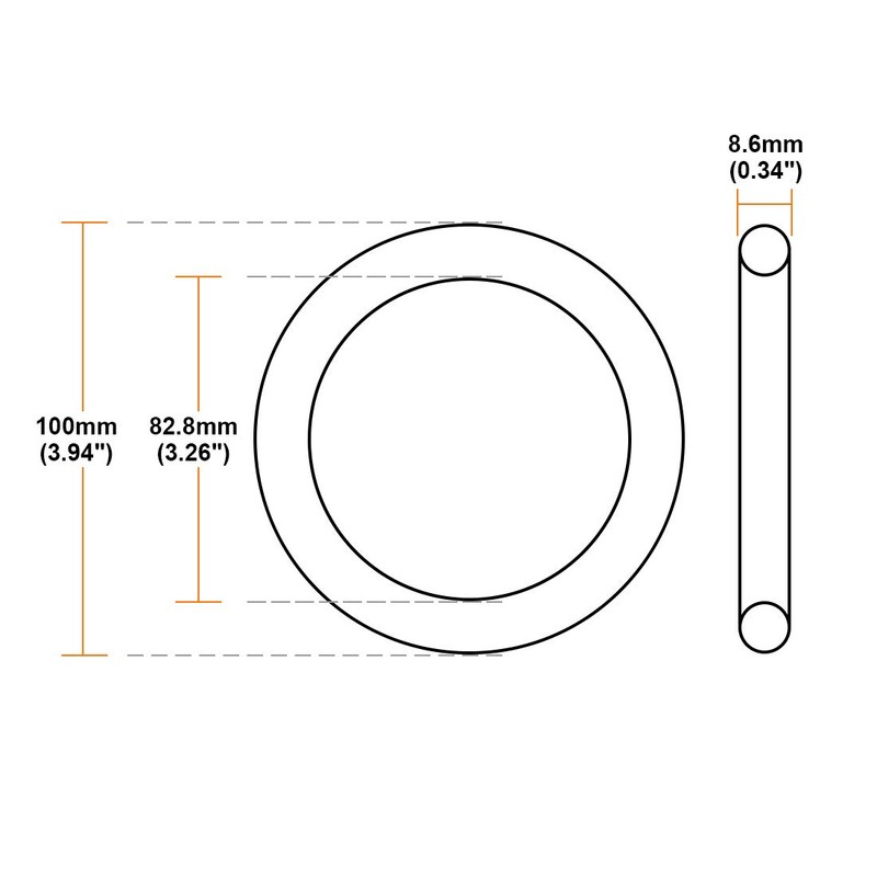 - Size: 100 mm outer diameter, 82.8 mm inner diameter, 8.6 mm cross-sectional diameter