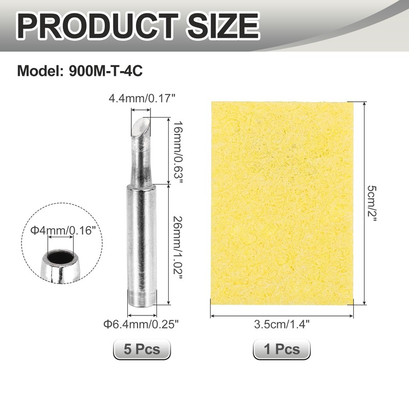 • Solder Iron Tips, Product Model:900M-T-4C; Material:Red Copper; Inner diameter x Outer diameter:4x6.4mm/0.16x0.25inch; Length:26mm+16mm/1.02inch+0.63inch; Width of soldering iron tip:4C(4.4mm/0.17inch); Package Content: 5 Pcs x Soldering Iron Tip; 1 Pcs x Dry Soldering Iron Cleaning Sponge Pad(3.5x5x0.7mm/0.14x0.2x0.03inch)