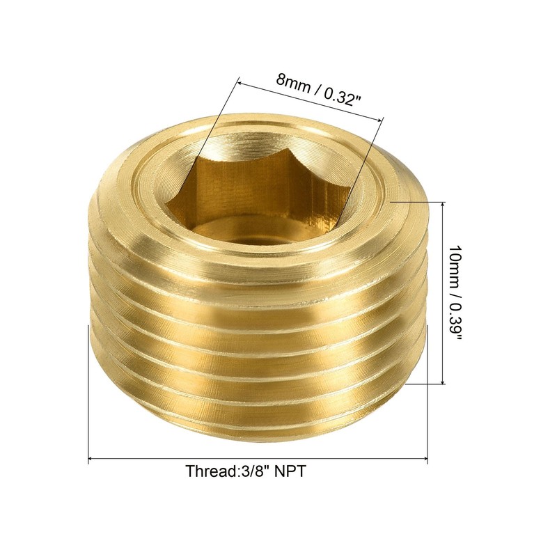 Material: Brass; Male Thread Size: 3/8" NPT; Hex Socket Width: 8mm/0.32"; Total Length: 10mm/0.39"; Package Content: 6pcs x Pipe Connectors