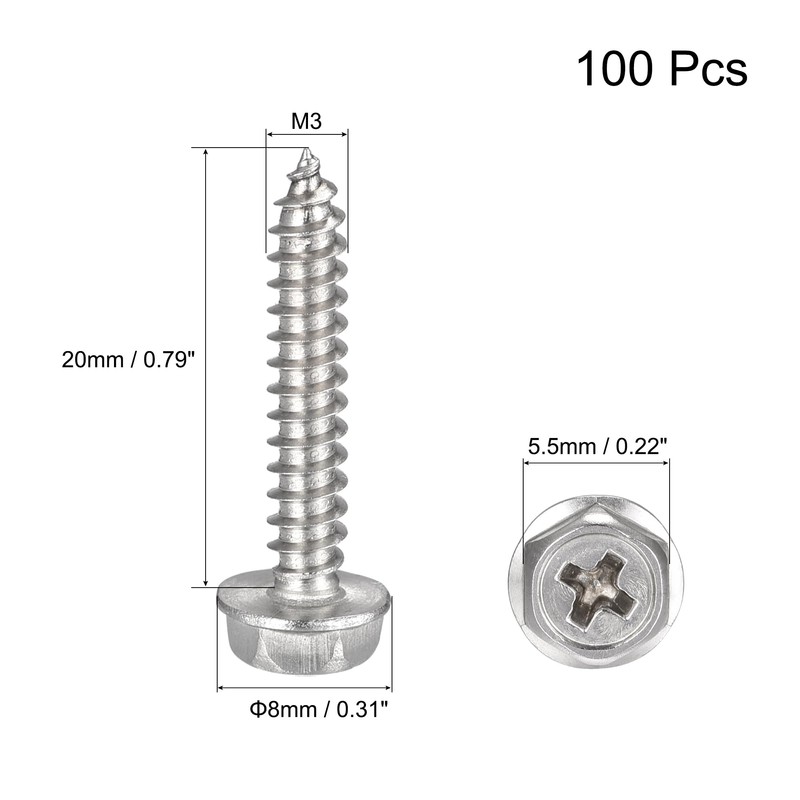 - Thread Size: M3 x 20mm; Hexagon Width: 5.5mm / 0.22"; Screw Head Size: 8 x 3.2mm / 0.31" x 0.13"(D*T); Screw Length: 20mm / 0.79". Package Content: 100pcs x Phillips Hex Washer Self Tapping Screws