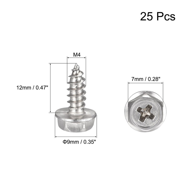 sourcing map Phillips Hex Washer Self Tapping Screws, M4 x 12mm 304 Stainless Steel Hex Flange Sheet Metal Screw 25pcs