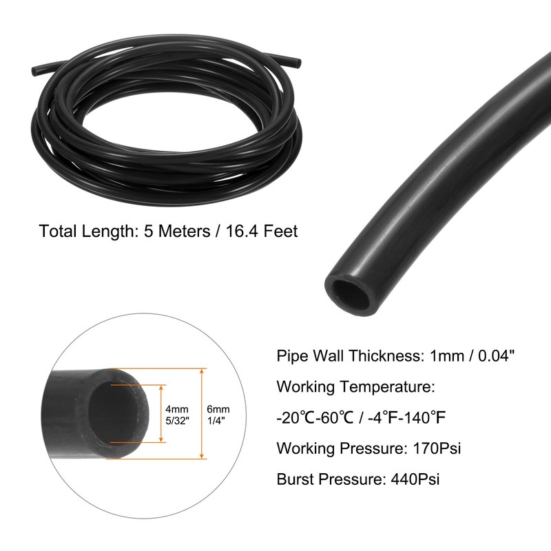 - Size - Outside Diameter: 10mm / 3/8"; Inside Diameter: 6.5mm / 1/4"; Total Length: 5 Meters / 16.4 Feet; Pipe Wall Thickness: 1.75mm / 0.07"; Working Temperature: -20℃--60℃ / -4℉-140℉; Working Pressure: 142Psi; Burst Pressure: 440Psi; Package Includes: 1 x Pneumatic Tubing Pipe Pu Hose.