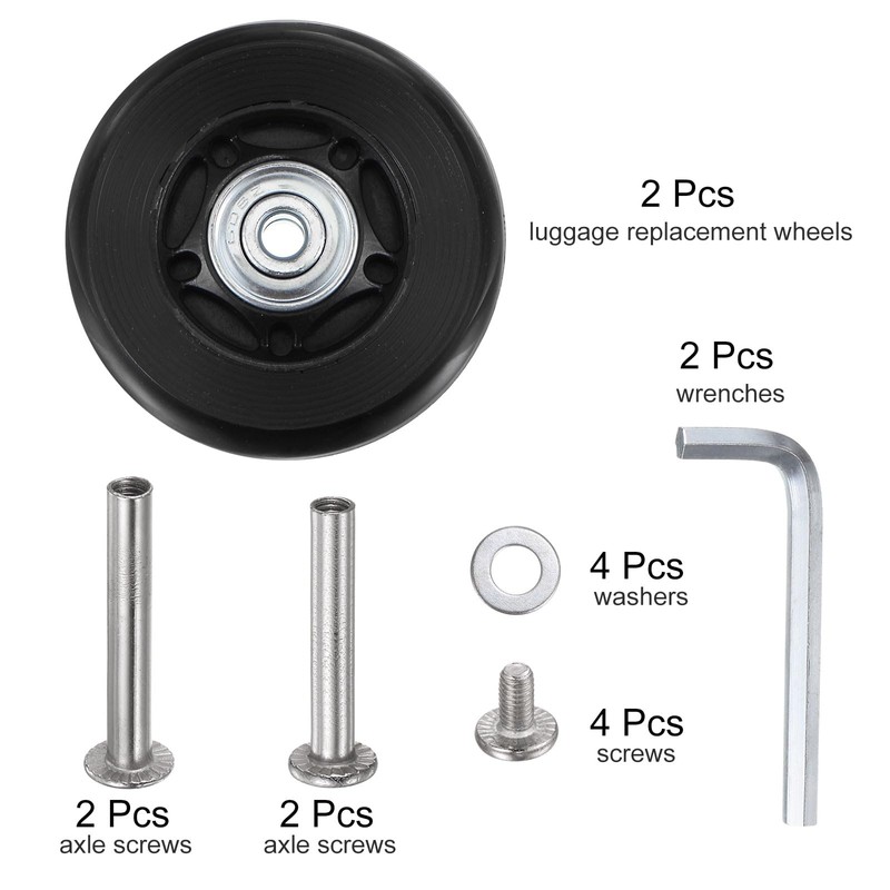 - Luggage Suitcase Replacement Wheels Set: You will get 2 luggage replacement wheels, 2 wrenches, 4 axle screws, 4 screws, and 4 washers, a full set means you have everything you need for a successful wheel replacement.