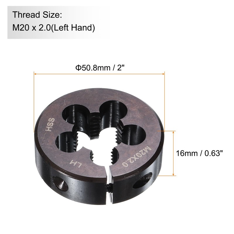 - Size - Metric Thread Size: M20 x 2; Outer Diameter: 50.8mm / 2"; Thickness: 16mm / 0.63"; Cutting Direction: Left Hand; Style: Adjustable Die. The round die can process, correct, or clean external threads.