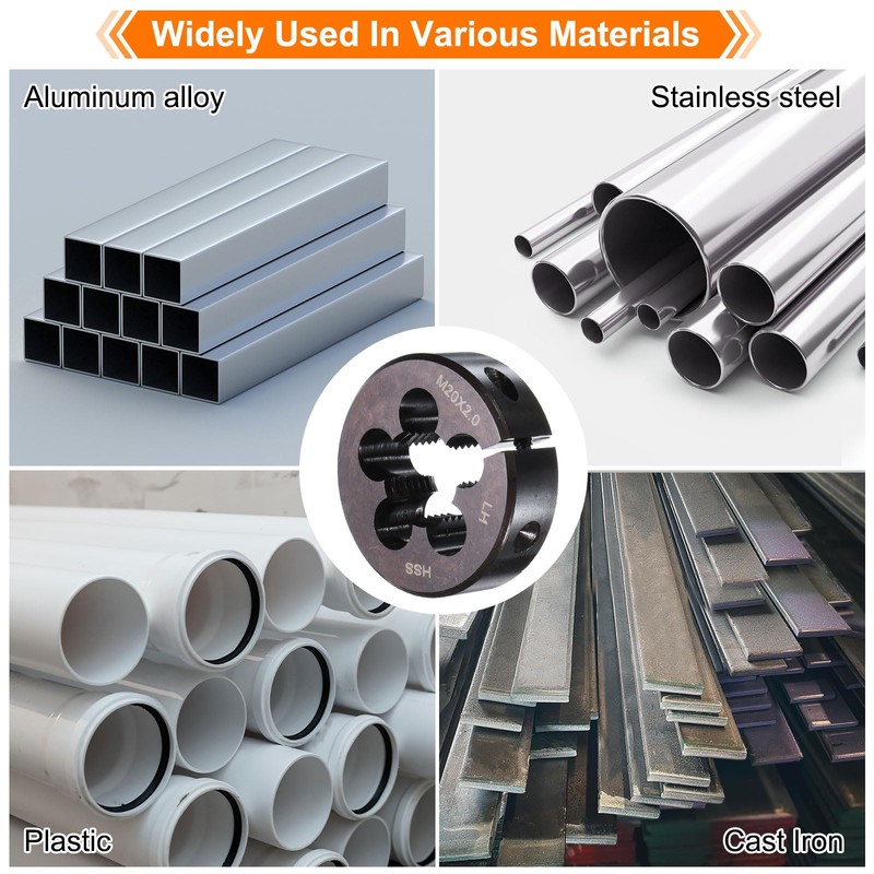 - Applications - Perfect for re-threading existing threads in hard materials like metal and making new threads in soft materials such as plastic. Use for general thread processing of stainless steel, aluminum alloy, cast iron, copper, iron, aluminum, and plastic. It is very suitable for maintenance and repair work of pipes, plates, and machinery.