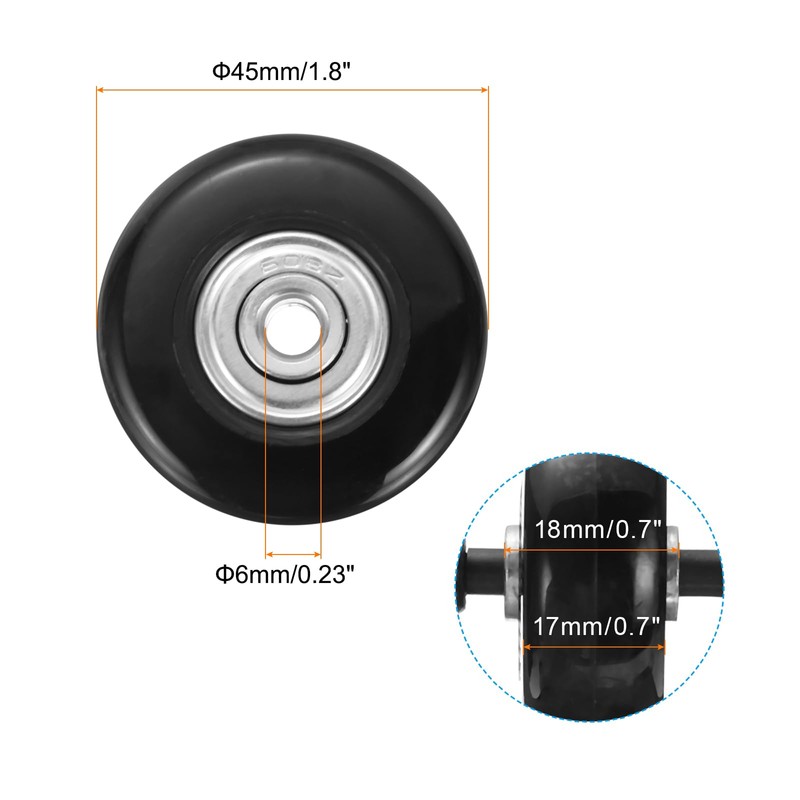 - Product Size: This luggage wheel diameter is 45 mm/1.8 inches, the wheel thickness is 18 mm/0.7 inches, the bearing thickness is 17 mm/0.7 inches and the Center Bearing internal diameter is 6mm / 0.23 inches. The axles' length is 36mm / 1.4 inches and 30mm / 1.2inches; Note: Please confirm the detailed size information before purchasing.