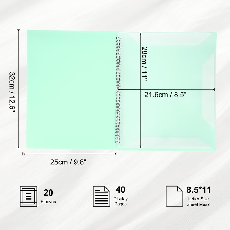 - Fits Paper Size: A4, 8.5" x 11" / 21.6 x 28cm (L*W); Music Notebook Total Size: 12.6" x 9.8" / 32 x 25cm (L*W); Material: PP; Color: Light Green; Capacity: 40 Pages;