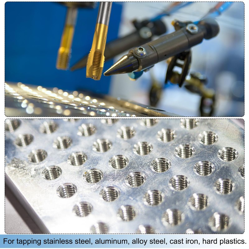 - Applications: Thread taps are great for through-hole threads. Can be used for drilling and tapping stainless steel, aluminum, alloy steel, ordinary steel, cast iron, non-ferrous metals, hard plastics, etc. Flutes on the screw tap help to remove chips and debris from the hole.