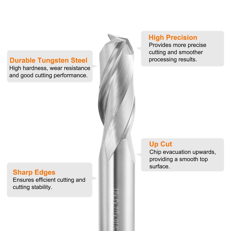 • Feature - 2 flutes and spiral design of the end mill router bits facilitate the smooth discharge of chips and avoid blockage during cutting. Precision cutting edges ensure clean and accurate cutting.