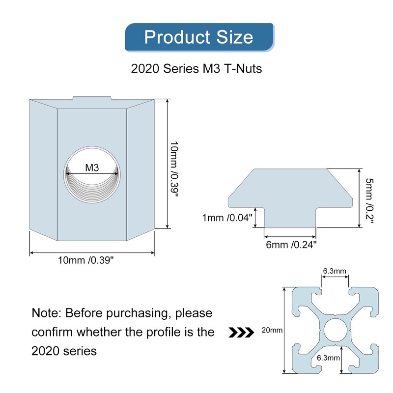• [Common Size] - Our 2020 series T nuts come in a size of 10mm x 10mm x 5mm with an M3 thread specification, 0.5mm pitch, 1mm step height, and 6mm step width.