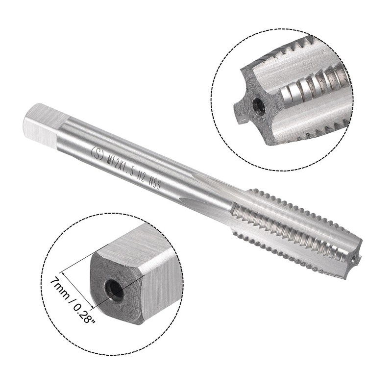 Thread Size: M12 x 1.5mm; Thread Length: 30mm/1.18"; Total Length: 88mm/3.46"; Square Shank Size: 7mm/0.28"; Tolerance Class: H2; Material: High Speed Steel (HSS), Number of Flutes: 4 Flutes