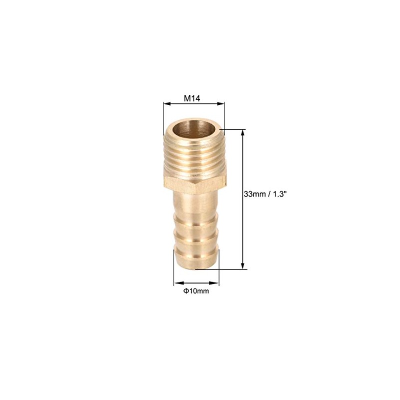- Größe: 10 mm Widerhaken x M14-1,5 männlich; Gesamtlänge: 33 mm / 1,3 Zoll; Sechskantbreite: 14 mm / 0,55 Zoll; Widerhakenlänge (ungefähr): 20 mm / 0,79 Zoll; Gewindelänge (ungefähr): 9 mm / 0,35 Zoll