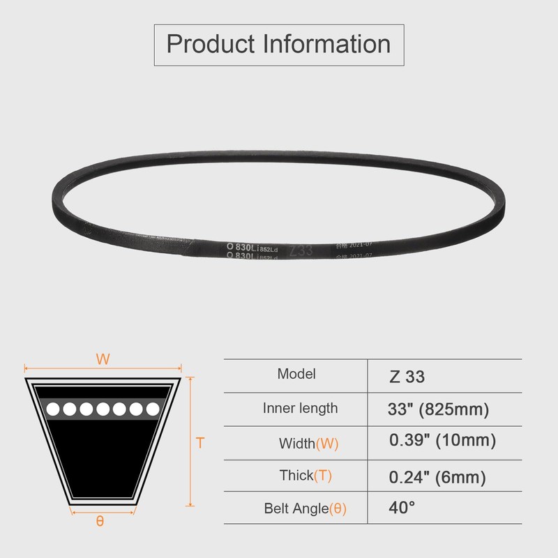 - Size: Z-33 v belt. Inner length: 33" (825mm), width: 0.39" (10mm), thickness: 0.24" (6mm).