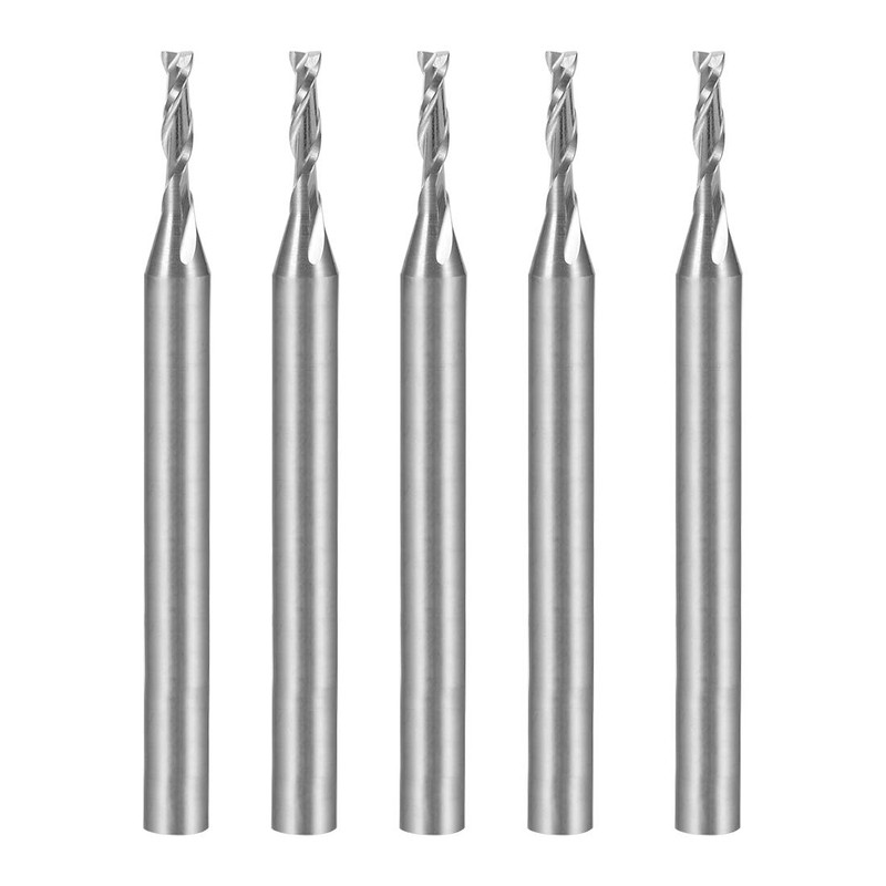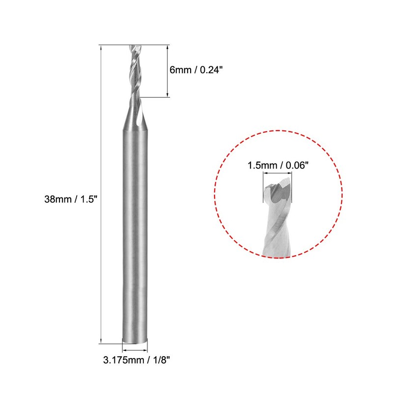 - 1/8 Inch CNC Bits: Shank Diameter: 3.175mm / 1/8"; Cutting Diameter: 1.5mm / 0.06"; Cutting Length: 6mm / 0.24"; Overall Length: 38mm / 1.5"; Number of Flutes: 2 Flutes