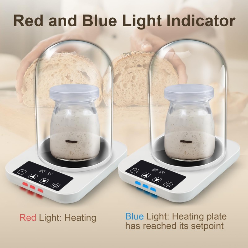 - [0-12H Timer Auto On/Off]: The sour dough starter heater pad with only 10W of power, but could warming rapidly. With the heater on, pressing the time button sets the auto power-off time, with the heater off, pressing the time button sets the auto power-on time. 0-12H timer set, intuitive color light (red or blue) allows you to clearly understand the status of the heater. A really safe and energy-saving starter warmer for daily use