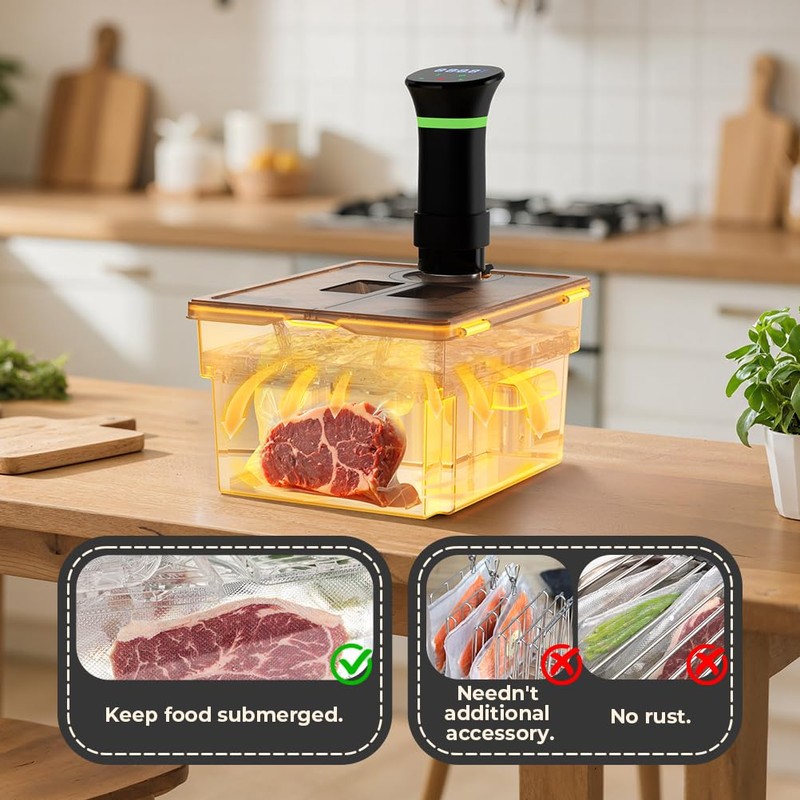 - Optimal Combination: Tested and experimented constantly, this sous vide container with built-in rack is tailored for our sous vide cooker, giving you a more professional cooking experience