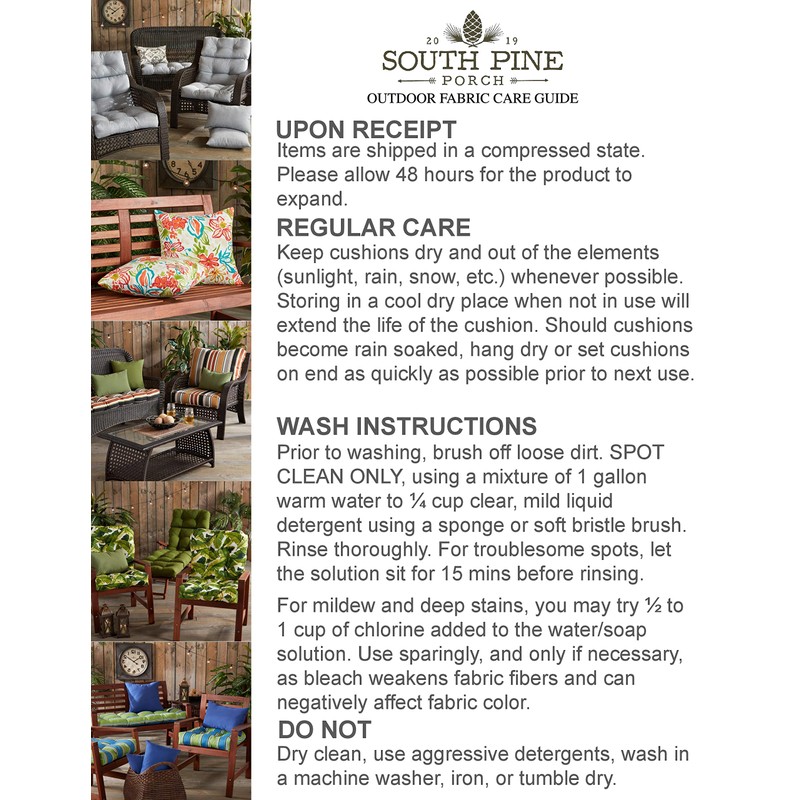 - Cushion cover is made from 100% outdoor polyester fabric that is UV, water, and stain resistant