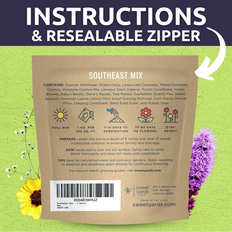 - SOUTHEAST REGIONAL MIX: Tailored to thrive in the humid conditions of the Southeast, this wildflower mix offers a blend of native flowers that add vibrant color and attract pollinators to your garden. With a mix of showy blooms and subtle greenery, it creates a naturalized, low-maintenance landscape perfect for meadows, borders, or pollinator gardens. Bring the beauty of the Southeast to your outdoor spaces with this easy-to-grow wildflower collection.