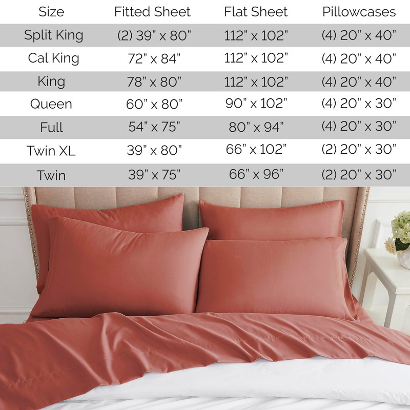 • Queen Size: Includes 1 Extra-Deep Pocket fully elasticized Fitted Sheet (60 in x 80in – fits up to 16 inch mattress), 1 Full Flat Sheet (90" x 102") and FOUR Standard Pillowcases (20" x 30") – Pillowcases have European envelope closure and completely hide the edge of the pillows inside.