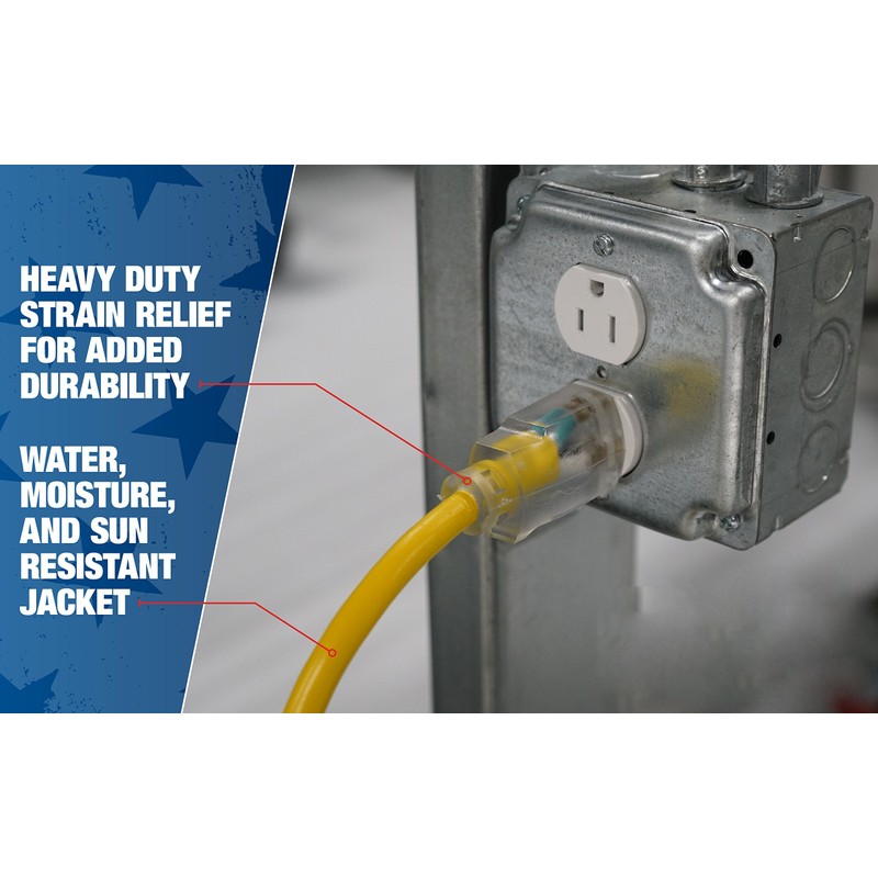 - LIGHTED END indicates power is on12 GAUGE HEAVY DUTY wire; 100 foot; 15 amp; 1875 wattsUL Listed