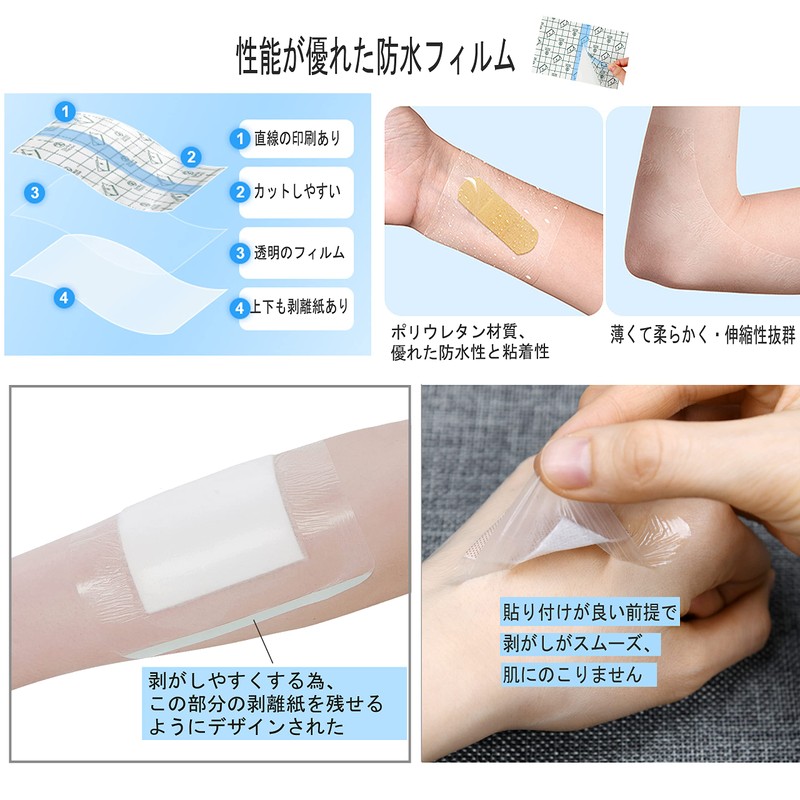 - 【用途が広い】傷に防水できるため、擦り傷や切り傷などの通常の傷だけでなく、手術後の傷にも適しており、水に関する活動、例えば水仕事や入浴などで活躍します。透析ポート、胸部カテーテル、人工肛門の創傷部位、PICCライン、化学療法ポート、栄養チューブ、腹膜透析、Gチューブ、乳房切除、医療チューブを使用しているあらゆる患者のシャワー保護に毎日使用できる使い捨て水分バリアーです。