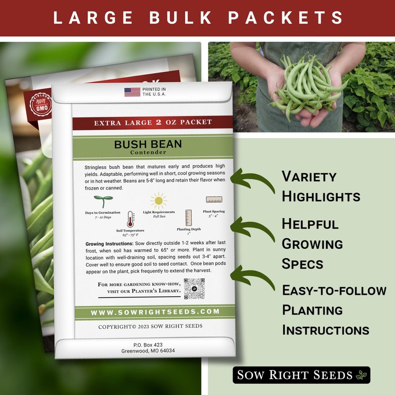 Sow Right Seeds - Bulk Contender Bush Green Bean Seeds for Planting - 2 Ounce, 110 Seeds - Non-GMO Heirloom Jumbo Packet with Instructions to Plant Outdoor Home Vegetable Garden - Grow Large Harvest