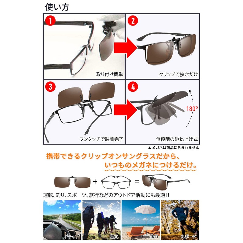- 2. [Clip-on Sunglasses] [Comfortable to Wear] You can attach it to your glasses with one touch, and it is a flip up type (clip on), so you don't have to remove it when you get into a dark place such as tunnel