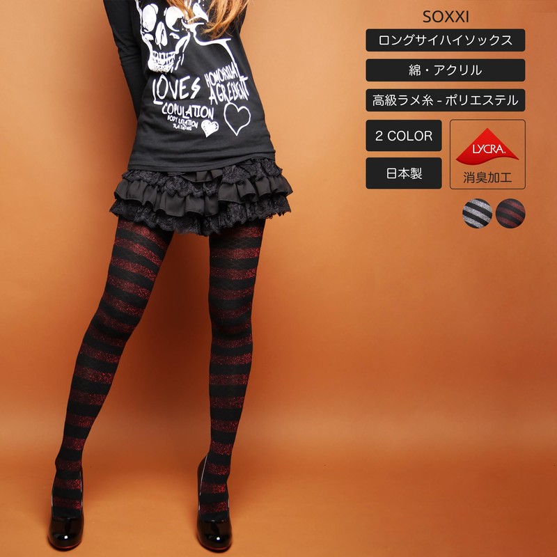 SOXXI Women's Long Thigh High Socks, Diamond, Glitter, Border, Antibacterial, 8.7 - 9.8 inches (22 - 25 cm), Made in Japan, multicolor (black / purple)