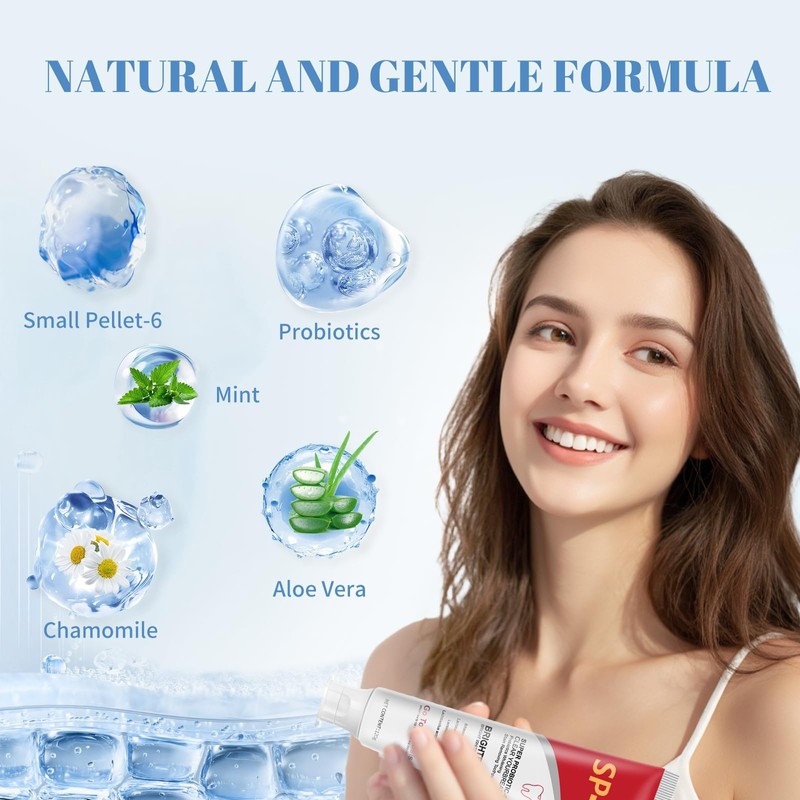 - 💎【Gradually Reveals a Brighter Smile】Sp 6 probiotic toothpaste whitening uses Small Pellet-6 particle technology. Micron-sized spherical particles can penetrate into the gaps of tooth enamel and effectively decompose stubborn stains such as coffee and tea stains, So that you can feel the whitening effect of professional care every time you brush your teeth, and your teeth will be brightened effectively!