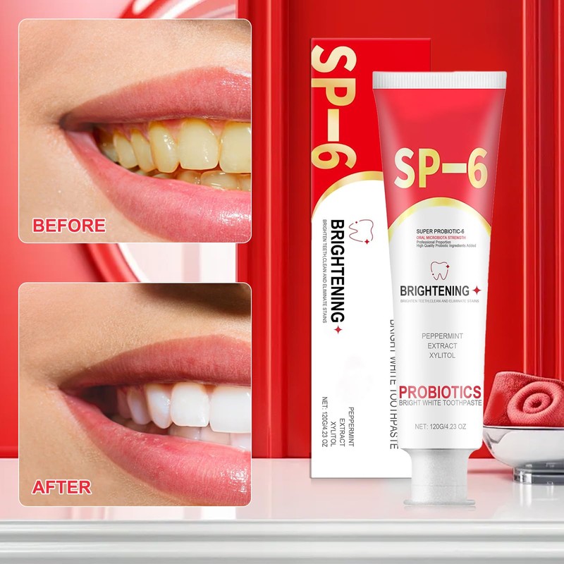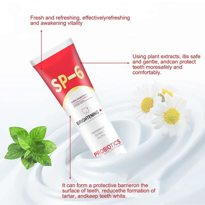- 【Sp-6 Probiotics Toothpaste】: Sp-6 toothpaste probiotic is specially formulated for the oral environment, effectively freshens breath and improves oral conditions. Sp-6 ultra whitening toothpaste allows you to open your heart and show your most beautiful smile every day.