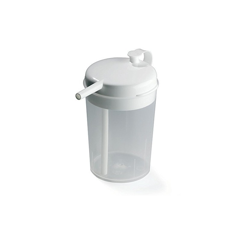 Specifically designed to eliminate the need to sit up or raise the head while drinking. Fluid will not spill from the cup even if it is lying on its side.