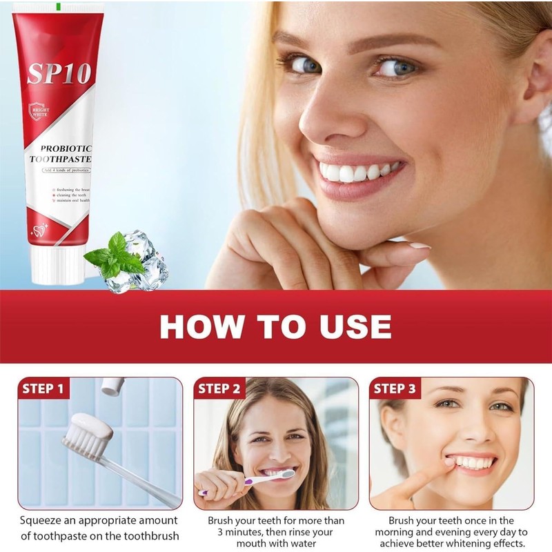 - 【Easy to Us】: Just slightly squeeze, apply a piece of probiotics bright white toothpaste on the toothbrush, and brush as usual. Brush your teeth with our Sp-10 Ultra Whitening Toothpaste for 3 minutes, twice a day for best results. With regular use, you'll notice a noticeable improvement of your teeth