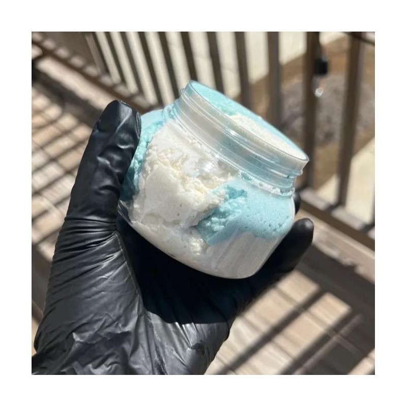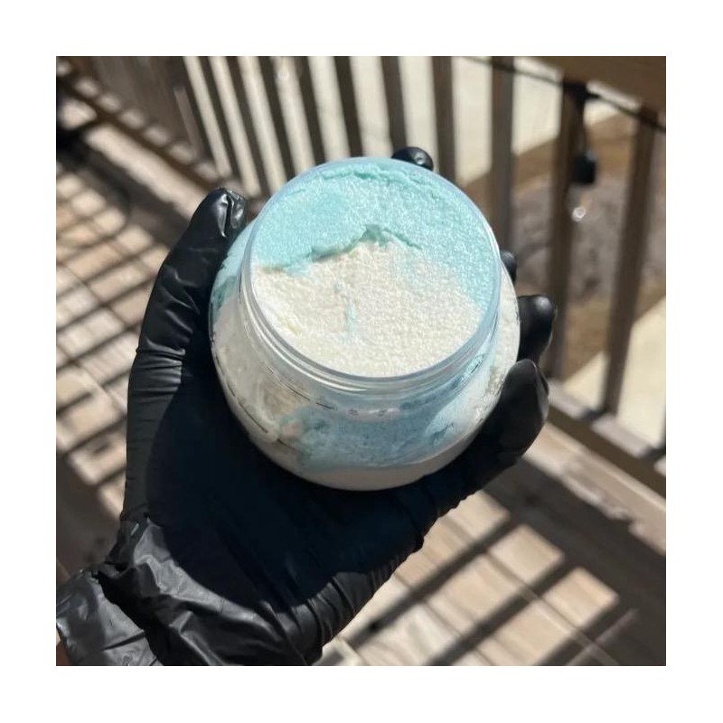 This foaming body scrub is a must have and if you don’t have it you are missing out! Spa Day in Miami is an emulsifying foaming sugar scrub that is smoothly blended with Mango Butter, Organic Sugar Crystals, essential oils and carrier oils that intensifies that spa day affect. The white scrub has a fruity, citrusy, and tropical type with top notes of orange, cherry, pear, mango, and pineapple. While the blue scrub has a green watery herbaceous type with a green aldehydic, top note, middle notes of cyclamen, mint, peach, jasmine, gardenia, and geranium, with a camphoraceous and white musky base note. Benefits : -Removes dead skin -Moisturizes and Hydrates skin -Allows your skin to absorb moisturizer better. -Leaves skin smoother and more even -Unclogs Pores ——————————-———————-— IMPORTANT DISCLAIMER: Our products should not replace personal judgment or medical treatment when indicated, they are not intended to diagnose, treat, cure, or prevent any disease. We can not be responsible for any allergies or adverse reactions to this product.
