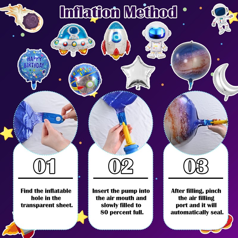 - How to Use: These space balloons can be inflated with helium or air. You can inflate them with a hand pump or an electric pump. It should be noted that the amount of inflation should not be too much, 80%-90% is the best.
