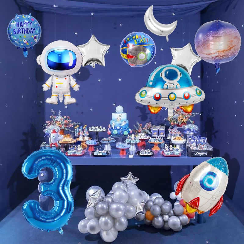 - PREMIUM FOIL MATERIAL: Our Space Balloons 3rd Birthday Decorations for Boys are made of premium aluminum foil, sturdy and reusable, safe to be used around kids. The color of balloons are shiny and chrome which are good decorations in kids space party. You can easily inflate and deflate these beautiful balloons decoration.