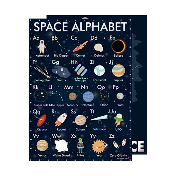 Space Alphabet and Astronaut Lost In Space Posters - Laminated 14x19.5 - Educational Chart, Classroom Poster and Decoration, Back to School Supplies, Learning Poster for Preschool, Kindergarten, Elementary, and Virtual Learning, Space Decor for Bedroom