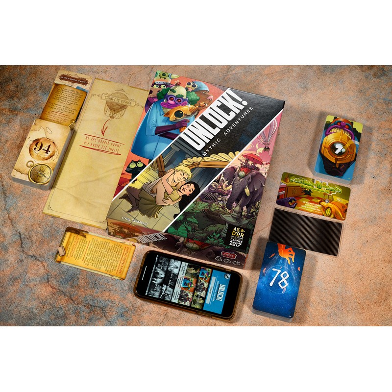 UNLOCK! Mythic Adventures is a cooperative card game inspired by escape rooms. Across three new scenarios, players seasrch rooms, combine objects, and solve puzzles. Explore Mythic Greece in the "In the clutches of Hades" adventure! Experience "Professor Noside's Animal-O-Matic" for an unforgettable adventure. Finally, travel "Around the world in 80 minutes" in a grand adventure inspired by Jules Verne's famous book.