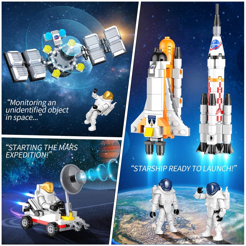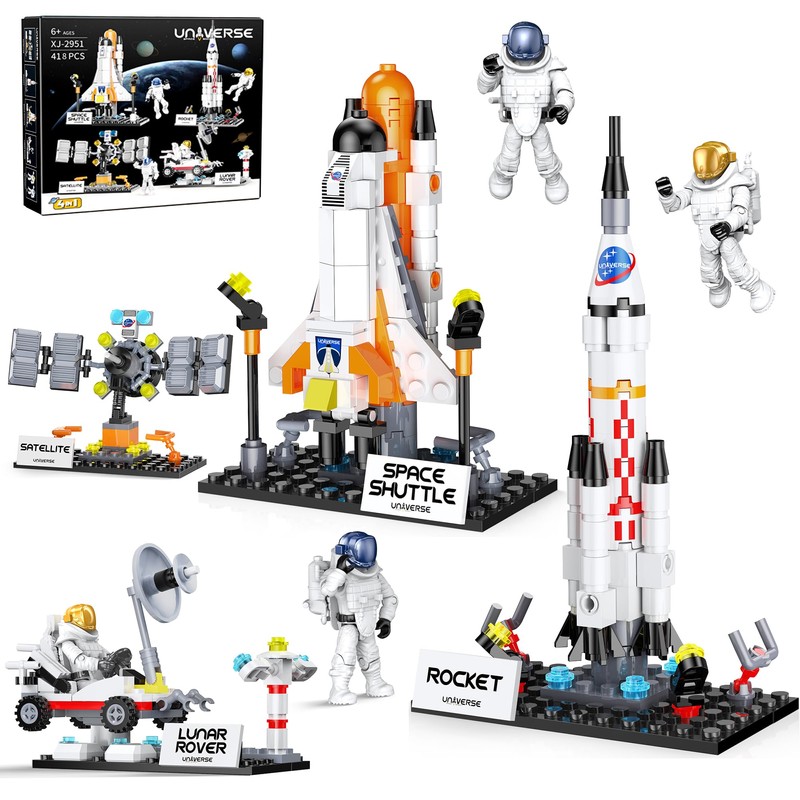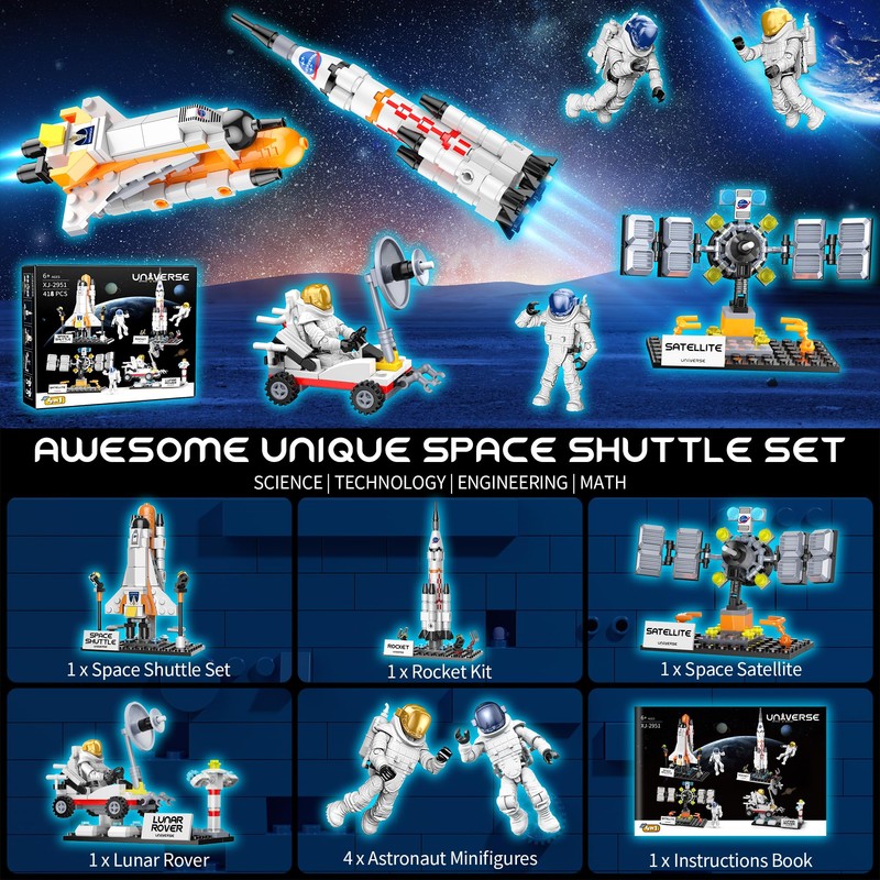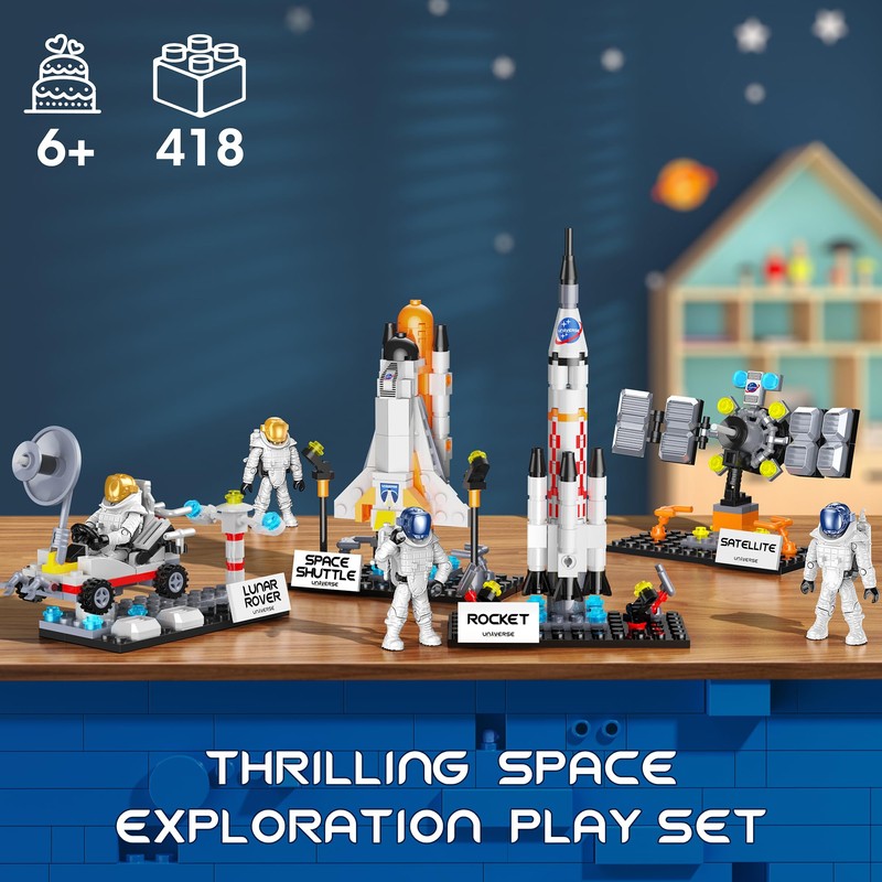 - 🪐 DEVELOP HANDS-OFF SKILLS - 418PCS building blocks can be assembled into 4 tool models to teach kids about the space program. Stay away from cell phone games and electronic screens and really focus on doing something well. While assembling, they will learn something about space engineering and construction principles, and will be more creative and focused. Perfect for kids who love space exploration and construction of all kinds.