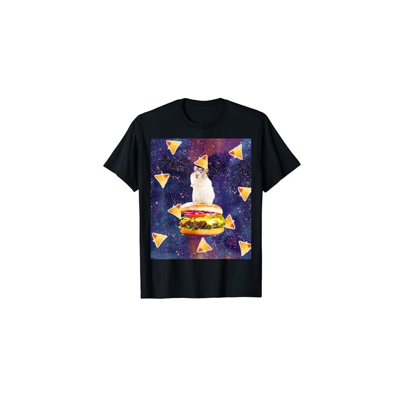 - Pick up this funny hipster design with a galaxy hamster on cheeseburger and tortilla corn chips.
