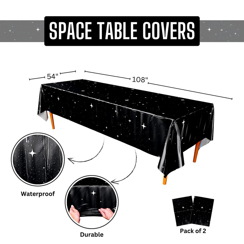 - [APPROXIMATELY 108" x 54"] Make lasting memories and drape your space themed party table in starry style with these awesome space tablecovers that measure approximately 108” x 54” each and work with square party tables.