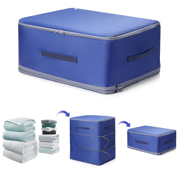 Space Saving Self Compression Organizer - Heavy Duty Clothing Storage Bag with Top Opening & Double Zippers, Reinforced Handles, Ideal for Duvets, Quilts, Blankets, and Travel Packing-Blue