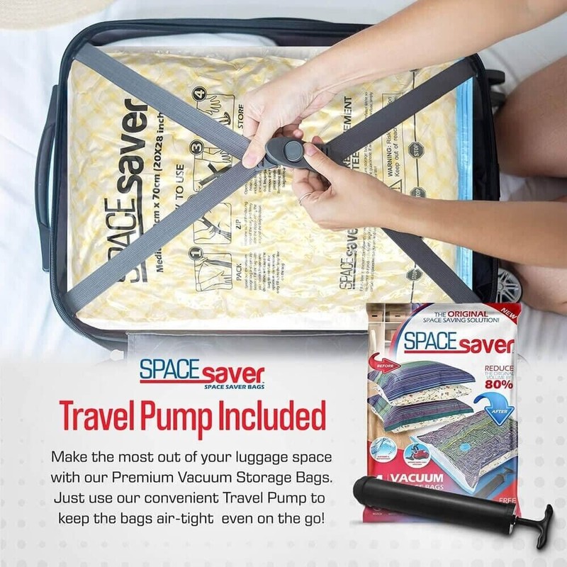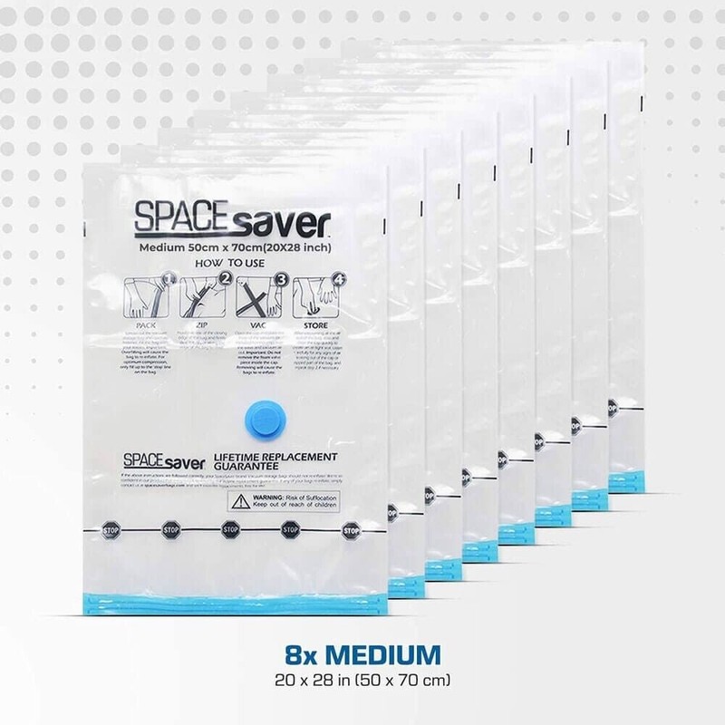 These Spacesaver premium space-saver vacuum storage bags are the ultimate solution to your storage needs! With our eight-pack of medium size bags, you can store away a range of items such as clothes, coats, duvets, bed sheets, towels, blankets, and more! These space-saver bags have 80% more space than other bags on the market, giving you more storage space in your wardrobe, closet, garage, basement, loft, and suitcase. They have a unique double-zip seal and triple-seal turbo valve to help squeeze every bit of air out of the bag, ensuring nothing gets back in. These space saver vacuum storage bags are heavy-duty, durable, puncture-resistant, and reusable. Use the included hand pump when you don't have a vacuum handy, or keep it in your suitcase to pack more clothes for your trip! These medium size bags measure 20 inches wide by 28 inches high and fit 8-10 sweaters each, making them perfect for those seasonal clothes you don't need to access as often