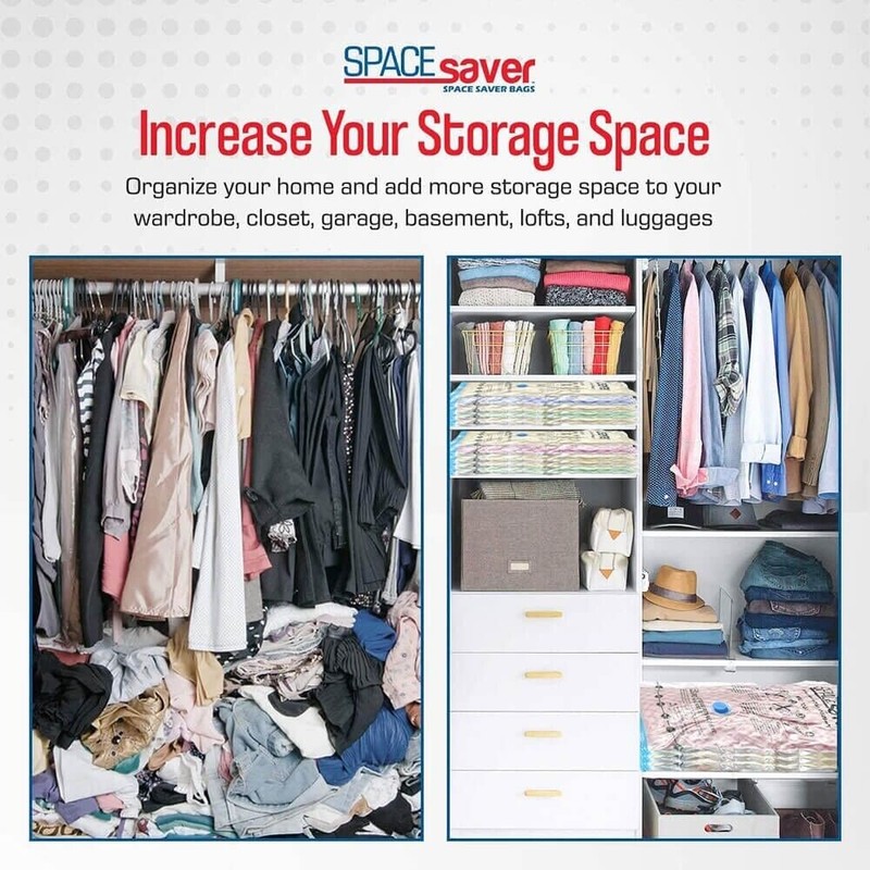 • Increase Your Storage Space by 80% : Without even having to clean out your closet! Our space-saver bags are an ideal solution for adding more storage space to your wardrobes, closets, garages, basements, lofts, and suitcases