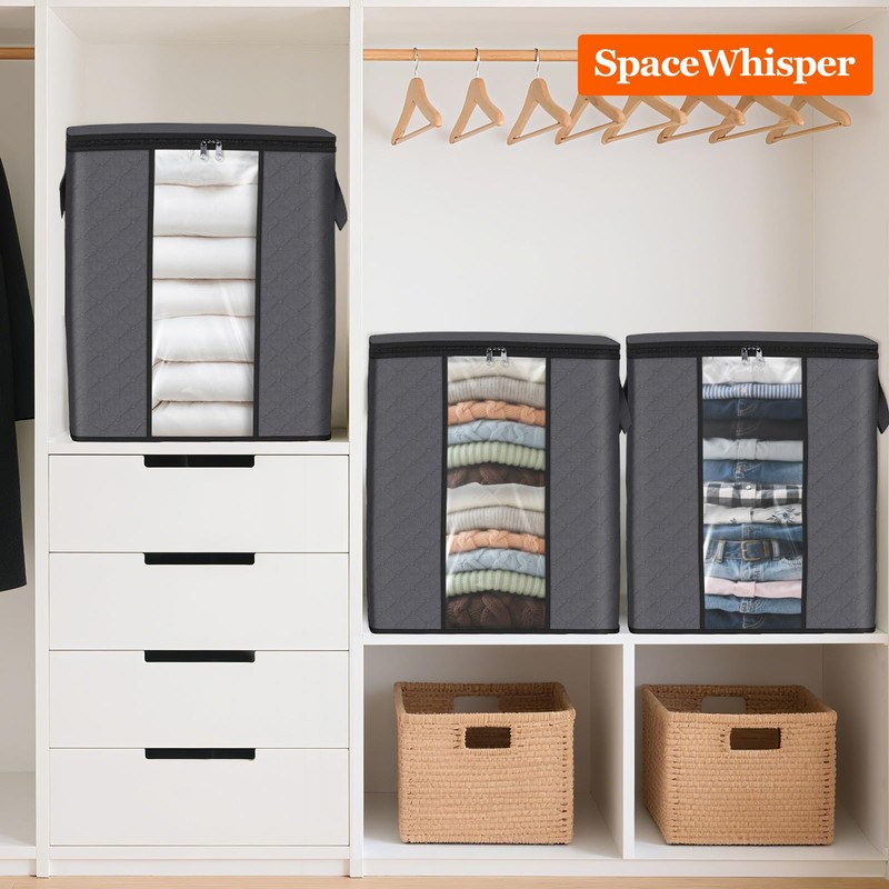 SpaceWhisper 8 Pack 100L Clothes Storage, Foldable Thick Fabric Blanket Storage Bags, Containers for Organizing Bedroom, Closet, Clothing, Comforter,Closet Organization with Handle,Grey