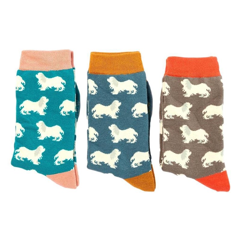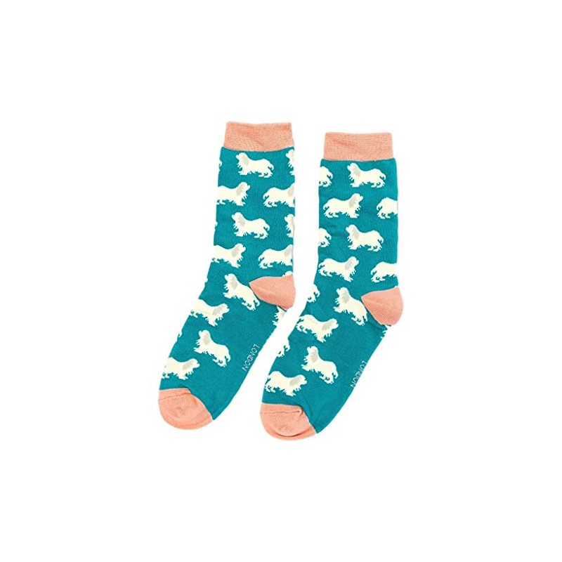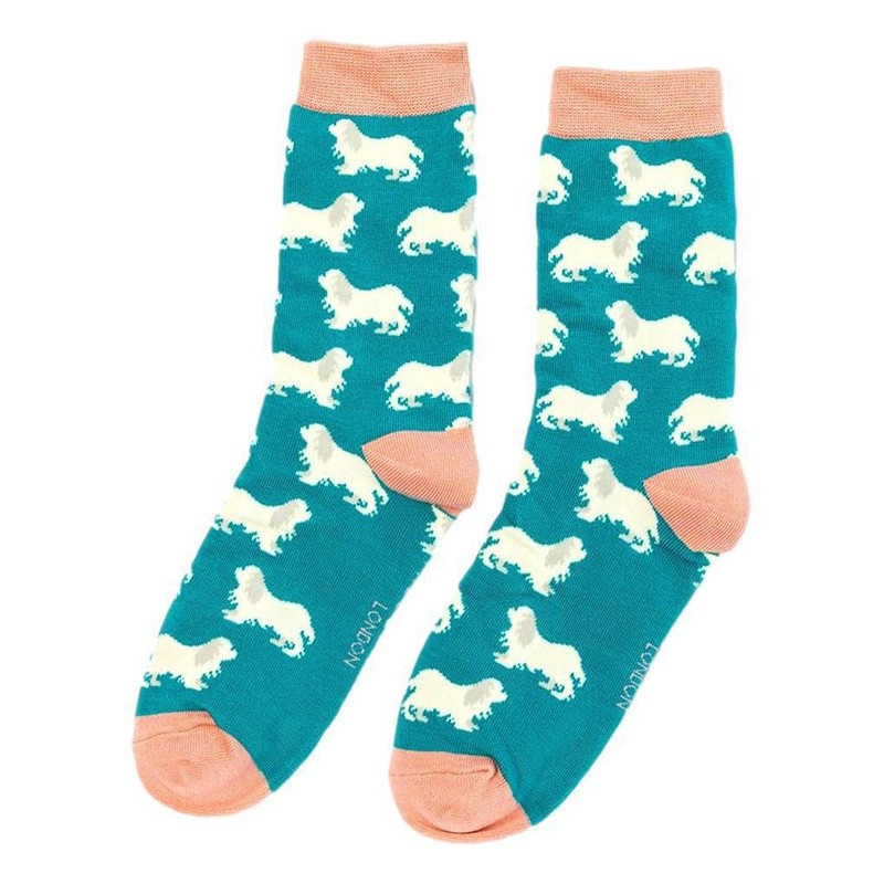 A pair of teal ladies socks with salmon pink heel, toes and world, featuring a repeating white Spaniels design.