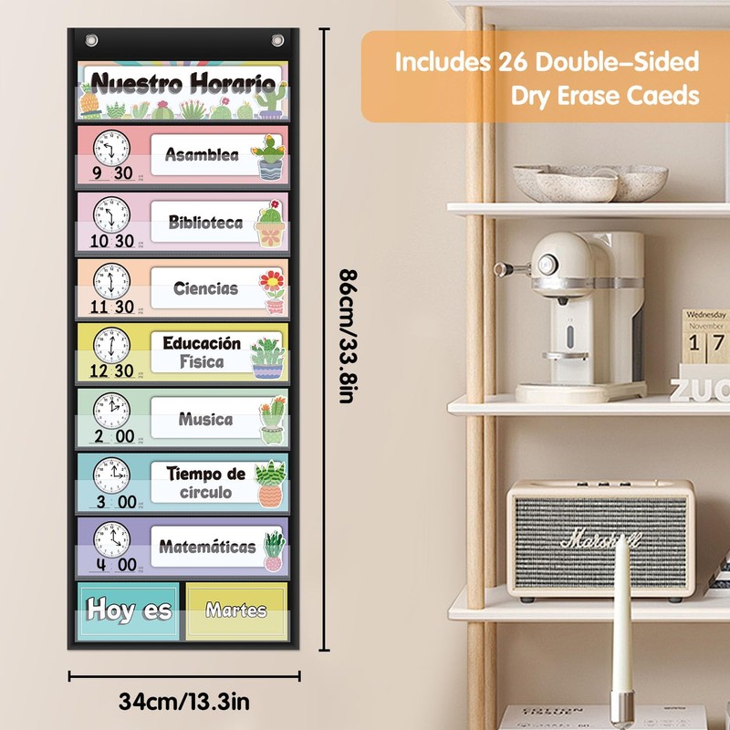 Introducing the Spanish daily schedule pocket chart for the classroom - a versatile and engaging tool to help students stay organized and on track throughout the day. This vibrant pocket chart features clear pockets to display daily activities, subjects, or routines in Spanish, making it an excellent resource for language immersion and cultural learning. With its compact size, it can be easily mounted on a wall or placed on a tabletop, ensuring visibility for all students. The pockets accommodate various card sizes, allowing teachers to customize the schedule according to their lesson plans. Constructed from durable materials, this pocket chart is built to withstand the rigors of daily classroom use. Enhance your Spanish language curriculum with this practical and visually appealing daily schedule pocket chart, fostering a structured and engaging learning environment for your students.