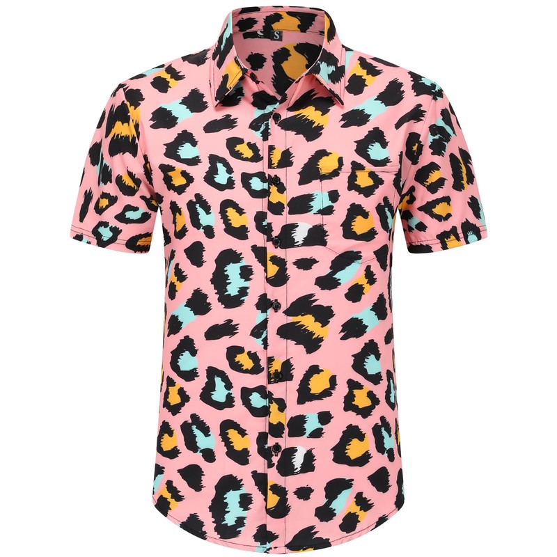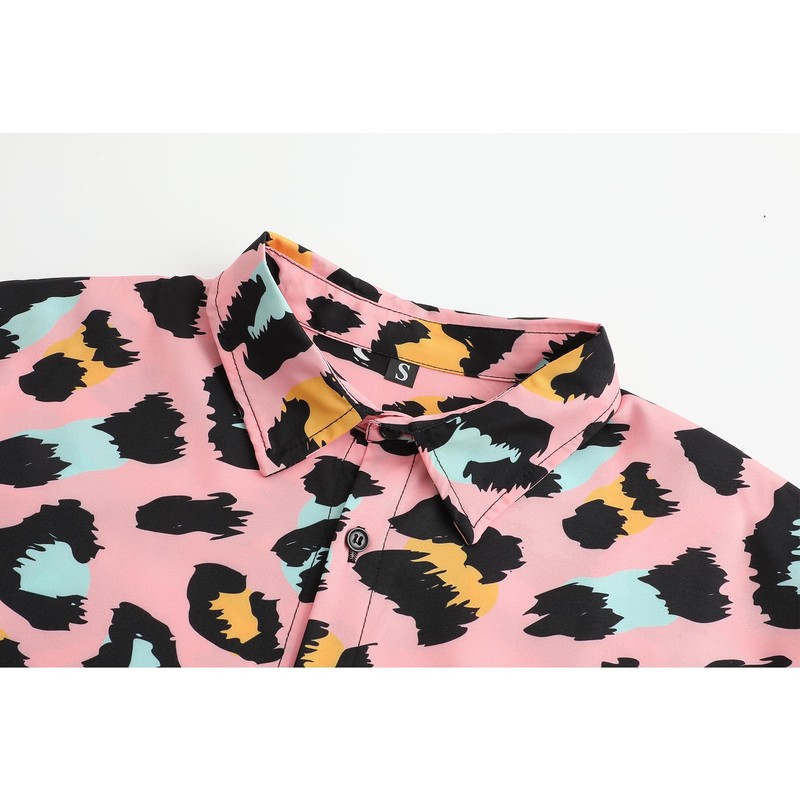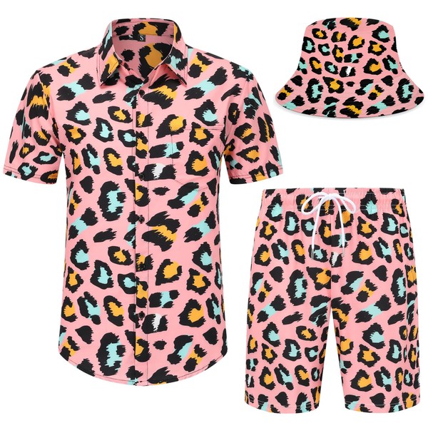 Spanoous Men's 2 Piece Tracksuits Rave Outfit Pink Leopard Print Shirt and Shorts Set with Bucket Hats 02-XL